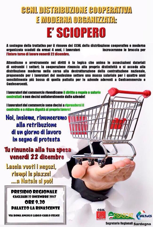 Venerdì 22 in occasione dello sciopero nazionale della Grande Distribuzione Organizzata si svolgerà un presidio regionale unitario a Cagliari davanti alla Rinascente in Via Roma angolo Largo Carlo Felice. L’orario sarà dalle 9.30 alle 12.30.
