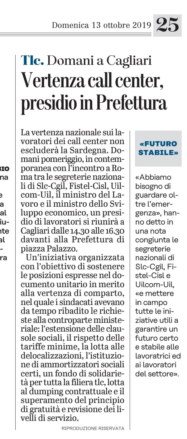 In contemporanea con l’incontro a Roma tra le segreterie nazionali di SLC-CGIL, FISTEL-CISL, UILCOM-UIL e il ministro del lavoro e il ministro dello sviluppo economico, a sostegno delle posizioni espresse nel documento unitario in merito alla vertenza nazionale CALL CENTER viene indetto un PRESIDIO delle delegate e dei delegati del settore per il giorno 14 ottobre 2019 dalle ore 14.30 alle ore 16.30 in P.za Palazzo 2 – Cagliari (fronte Prefettura)